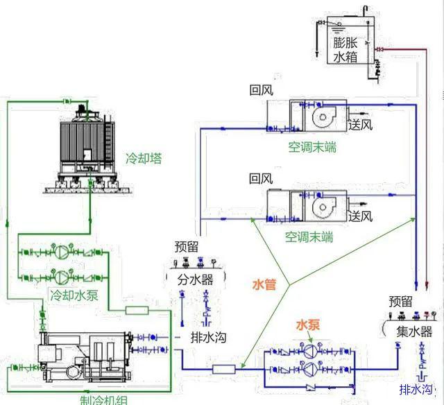 我们可以把空调的冷冻水系统看成人体的一个血液循环。 水泵就相当于是我们的心脏,它为我们的系统提供动力供水系统可以看作是我们的动脉,为我们的空调机组来提供冷量,各个空调的末端可以看成我们人体的各个器官,冷冻水的回水可以把它看成人体的静脉。
