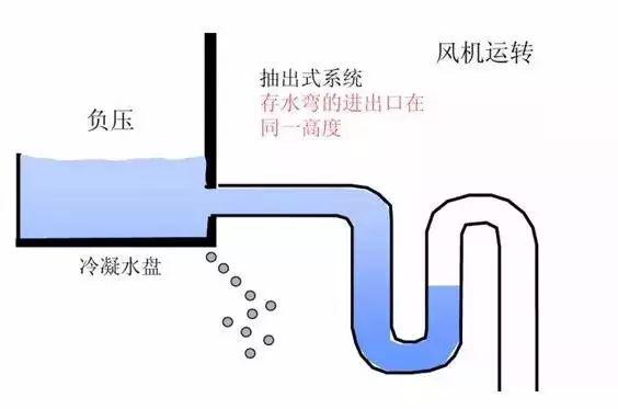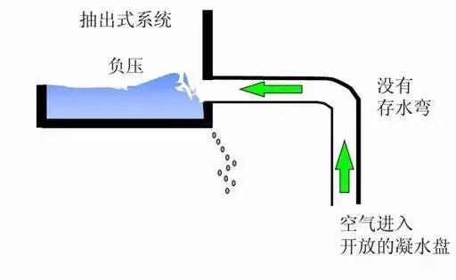当机组运转时,冷凝水生成并溢出冷凝水盘或被在开放的冷凝水管中的空气冲击而滴水和带入风机进入送风管道,主要原因是由于冷凝水盘的出口处不断有空气进入,冷凝水无法排除导致水位上升而溢出冷凝水盘至下方的保温盖板;由于盖板上方是负压区,冷凝水也无法从缝隙中溢出不断的积聚,但当风机停转时冷凝水会像下雨一样流出。